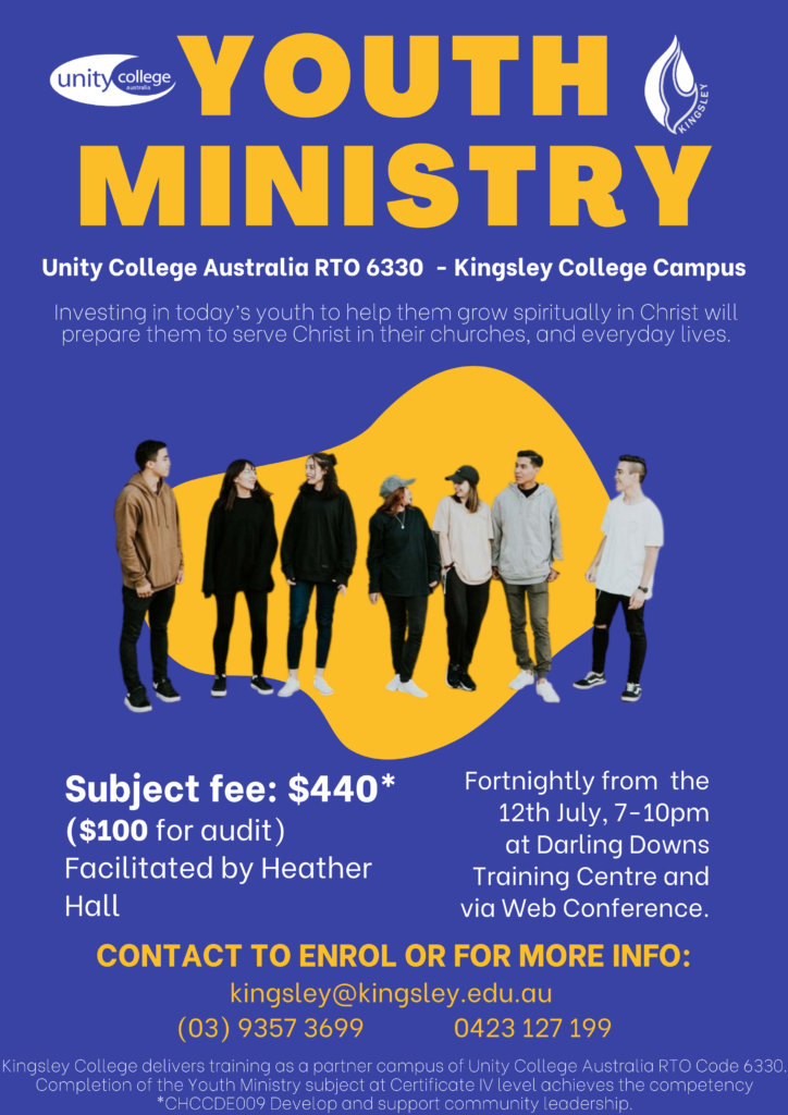 “Don’t let anyone look down on you because you are young, but set an example for the believers in speech, in conduct, in love, in faith, and in purity.” (1 Timothy 4:12). In our recognition of God’s calling and purpose to grow young people, this subject seeks to guide and support church leaders in their youth ministries. Enrol now to join the class in Darling Downs in person or via web conference for semester II 2022.